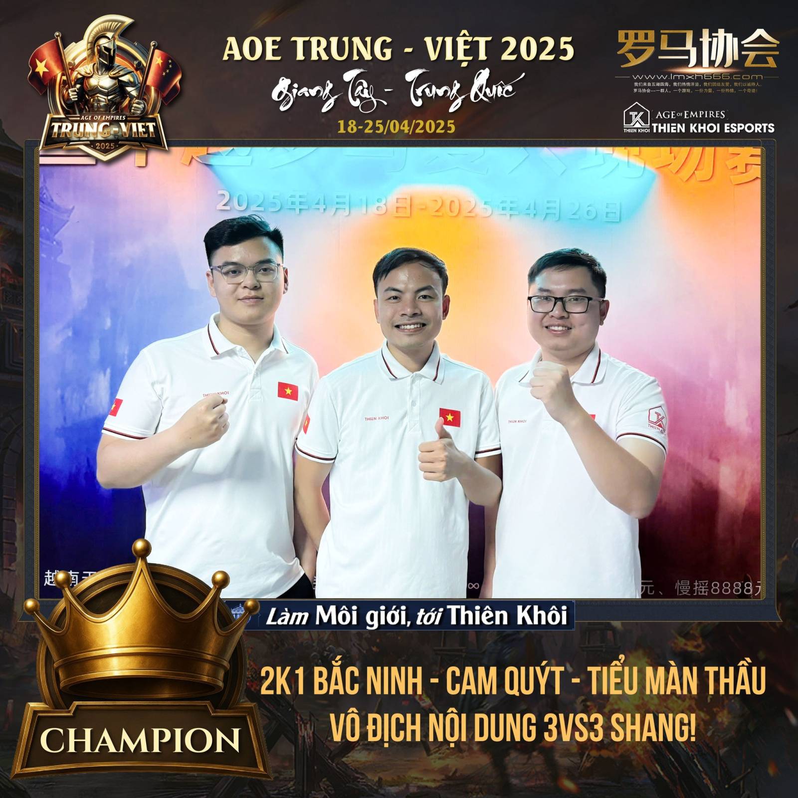 Mới đây, giải AoE Trung–Việt 2025 do Hiệp hội La Mã tổ chức tại thành phố Bình Hương, Giang Tây đã chính thức khép lại sau 6 ngày (18–24/04/2025) tranh tài kịch tính. Tổng giá trị giải đấu lên đến 250.000 nhân dân tệ, tức 900 triệu VNĐ. Trong đó, giá trị bản quyền hình ảnh là 116.000 nhân dân tệ, tức 400 triệu VNĐ.